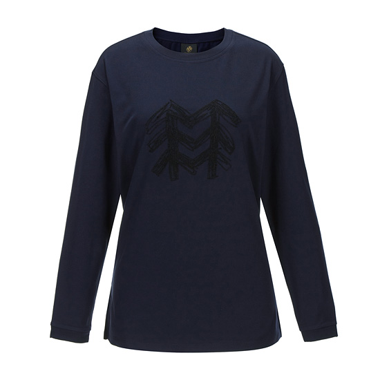 - 변형된 실루엣과 긴 기장감이 돋보이는 여성 긴팔 티셔츠.