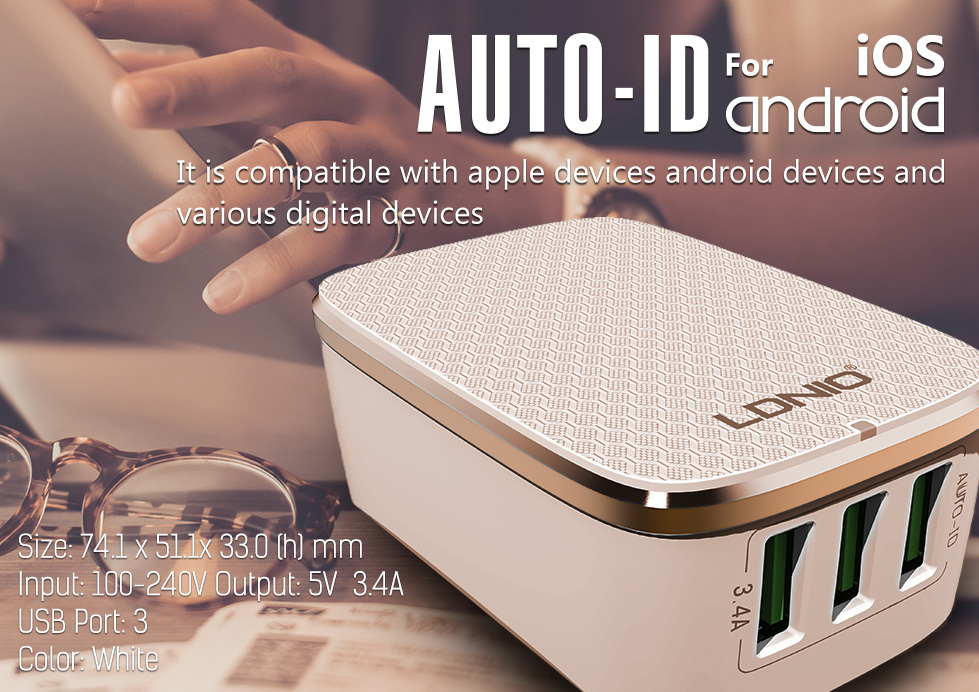 This 4-port Auto-ID travel charger is a versatile, powerful and reliable charger, convenient, safe, and easy to use. It provides plenty of power to charge 4 mobile devices simultaneously at full speed. With high quality and multiple protections to ensures safety, it is ideal to be used at home,office or during travel.