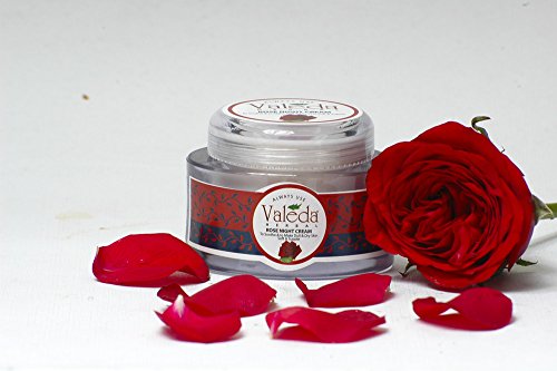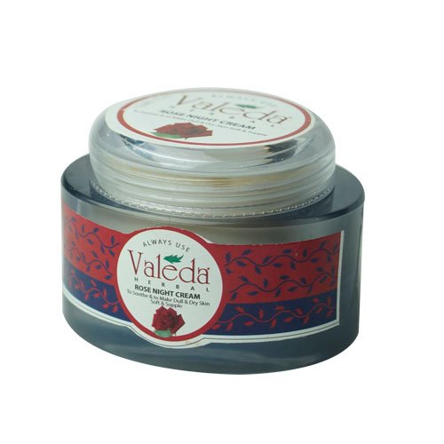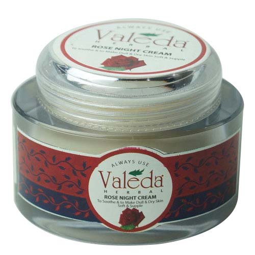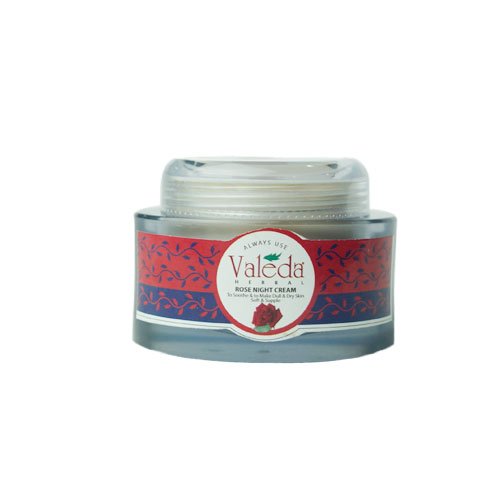 INGREDIENTS:- Rose(Gulab) , Calendula officialis, Olive(Jaitun), Almond , Coconut, Bitter Orange/ Narangi, Sesame/Til(Sesamum Indicum). TEXTURE:- Rich oily emulsion BRIEF DESCRIPTION:- In cold weather, when surface of your skin is damaged by exposure to dry weather outside or heaters inside, your Rose Night Cream enriched with nourishing property of rose is to be firmly massaged and left on the skin overnight. This cream performs nicely as emollient and as lubricating cream. Inclusion of Rose & Calendula soothe the irritated skin. Clove helps this cream to prevent & control the skin breakouts. HOW TO USE:- Better clean your skin with Valeda Herbal Nutmeg Instant Deep Cleansing Milk before applying this cream. Use Valeda Herbal Calendula Moisturizing Lotion in morning & Valeda Herbal Rose & Mint skin Tonic in evening for best effects.