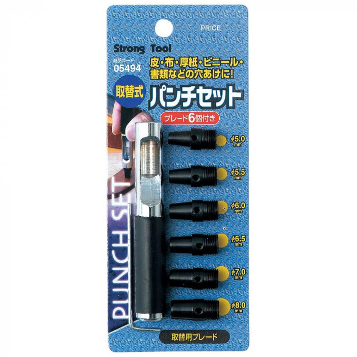 fk094igrjs皮・布・厚紙・ビニール・書類などの穴あけ作業用に サイズ 個装サイズ:2×7×6.2cm 重量 個装重量:118g 仕様 取替用ブレード6個付き (Φ5、Φ5.5、Φ6、Φ6.5、Φ7、Φ8mm) 生産国 中国 6種類の穴が簡単にあけられます 皮・布・厚紙・ビニール・書類などの穴あけ作業用に