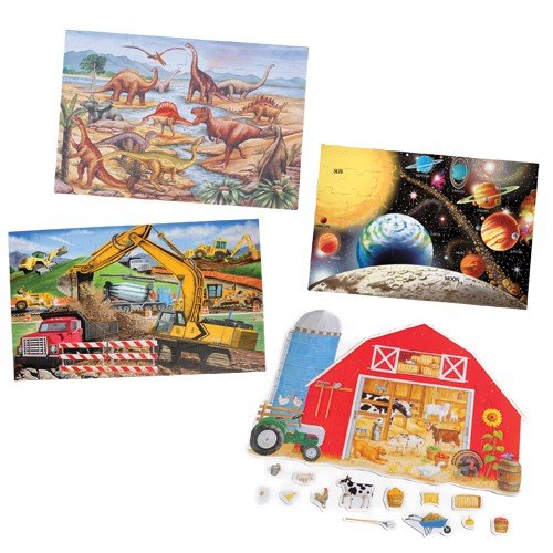 Product Description As children put together these jumbo-size, easy-to-manipulate pieces, it forms a giant puzzle. Puzzles depict construction, solar system, Dinosaur, and a big barn. 0