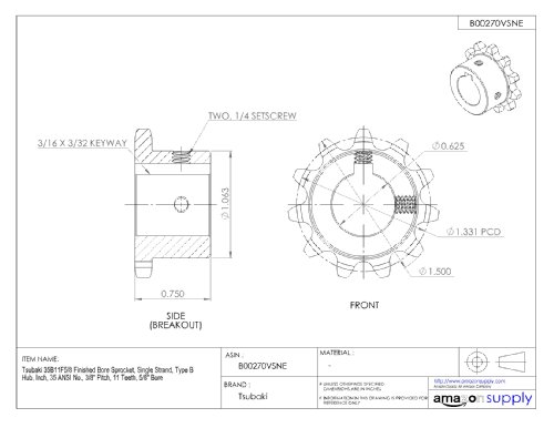 Tsubaki 35B11FJ Finished Bore Sprocket, Single Strand, Inch, #35 ANSI No., 3/8" Pitch, 11 Teeth, 5/8" Bore