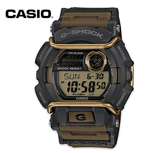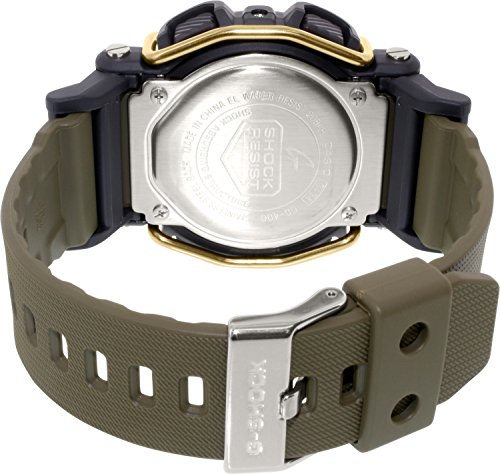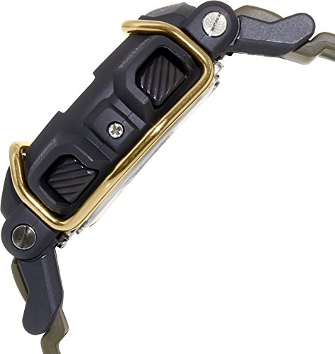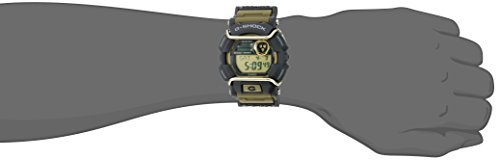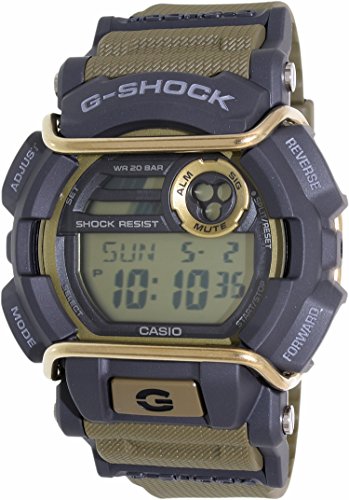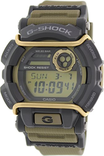 Studio : Casio Publisher : Casio Binding : Watch Product Description Grey resin case with a olive green resin strap. Fixed bezel. Green dial. Dial Type: digital. Full auto calendar. Quartz movement. Scratch resistant mineral crystal. Case dimensions: 55 mm x 49.7 mm. Case thickness: 16.6 mm. Tang clasp. Water resistant at 200 meters / 660 feet. Functions: hour, minute, second, date, world time, 5 alarms, countdown timer, backlight,. Casio G Shock Face Protector Street Sport Series Mens Watch GD400-9. 0
