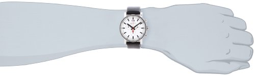 Stainless steel case with a black leather strap. Fixed stainless steel bezel. White dial with black hands and index hour markers. Minute markers around the outer rim. Dial Type: Analog. Date display at the 12 o'clock position. Chronograph - sub-dials displaying: three - 60 second, 30 minute and 1/10th of a second. Quartz movement. Ronda 5040.b engine. Scratch resistant sapphire crystal. Pull / push crown. Solid case back. Case diameter: 40 mm. Case thickness: 9 mm. Round case shape. Band width: 20 mm. Tang clasp. Water resistant at 30 meters / 100 feet. Functions: chronograph, date, hour, minute, second. Additional Info: withstands rain and splashes of water, but not showering or submersion. Casual watch style. Watch label: Swiss Made. Mondaine Evo Big Chronograph White Dial Black Leather Mens Watch A690.30304.11SBB.Feature