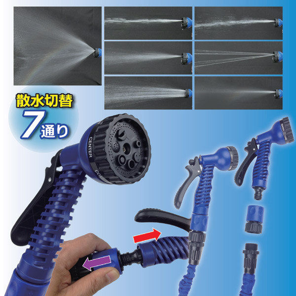 一見、普通の短いホースに見える本品「こんなホースで水を撒くことができるの?」と思って水道栓をひねってみると、見る見る間に5mしかなかったホースが、もこもこっと約3倍の長さ、15mまで伸びちゃいます。もちろん、長さだけでなく、散水ノズルも7種類の散水パターンを選べる本格ホースセットです。ホースリールでよくある、伸ばした時のホース絡みもありません。従来の重くてカサばるホースリールとは違い、重さは500g(ホースのみ)と軽量でしかもコンパクトなので、女性でも持ち運びがラクで収納も面倒なし。