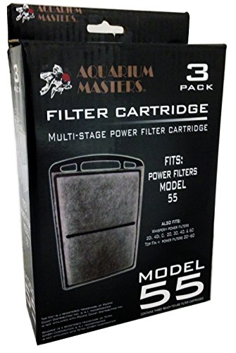 Replacement Filter Cartridge for Whisper Power Filter 20i, 40i, C 20, 20, 40, 60 & Top Fin Power Filter 20, 30, 40, & 60, & Aquarium Masters Model 55! This replacement filter cartridge is a Multi-Stage disposable cartridge: Stage One is mechanical - Advanced multi-layered polyfiber floss traps micro & macro organic particles and foreign debris. Stage Two -Chemical -Super-Activated carbon granules absorb many disolved containinants, odor, toxins, and discoloration. Stage Three Biological ( Sold separately) - High-flow bio-sponge promotes colonization of beneficial bacteria essential to a healthy aquatic environment. Easy to use & disposable. No mess cartridge handle & single-piece construction keeps hands dry & clean during cartridge changes. Easy to use & disposable. No mess cartridge handle & single-piece construction keeps hands dry & clean during cartridge changes. High-Strength plastice frame for increased cartridge rigidity. Media-Grid ensures distribution of carbon granules throughout the cartridge for maximum filtration & flow. Other Aquarium Masters & Blue Spotted items to consider, air line tubing, submersible heaters, refugiums, nirate pad, ammonia pad, polyfiber pads, power filters, air stones, bio-rings, UV sterilizer, heat pads, & heat lamps.Feature