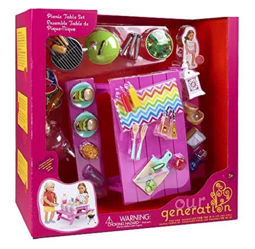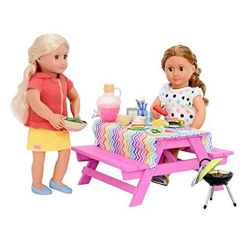 INCLUDES 17 ACCESSORIES - The Picnic Table Set includes 1 picnic table, 1 table cloth, 1 functioning lantern, 1 barbecue with lid, 1 pair of tongs, 1 vase with flower, 1 napkin holder, 1 pitcher of lemonade, 2 glasses, 1 cutting board, 1 knife, 2 salad utensils, 2 salad bowls, 1 bowl of salad, and even more!