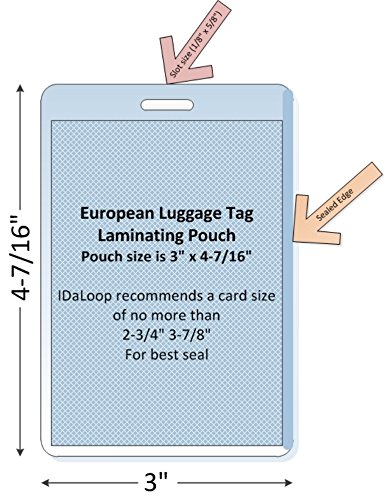 Studio : Pouch Coil, LLC Publisher : Pouch Coil, LLC Binding : Apparel Product Description Way cool sized luggage tag pouches! These laminating pouches are a step bigger that your normal sized luggage tag pouches. Laminated luggage tags will hang with your luggage, golf bag, gym bag, or anything you want to hang a tag on. These are a nice weight pouch for all purposes. There are 100 pouches in each package. These are high quality glossy clear pouches with rounded corners. Works with GBC, Ibico and most other pouch laminators. Size: 3" x 4-7/16" Thickness: 5 MIL Pouches per package: 100 Need Loops or clips? We have those too! Pouches are crystal clear. Graphic is colored to illustrate where the pouch edges are. The dashed line is used to indicate the size that the item to be laminated should not exceed. For the best seal it is best to allow for 1/8" from the edge of the item being laminated and the edge of the pouch. Dimensions shown above and in the graphic are the size of the pouch. Comes with one carrier per 100 pouches. 0