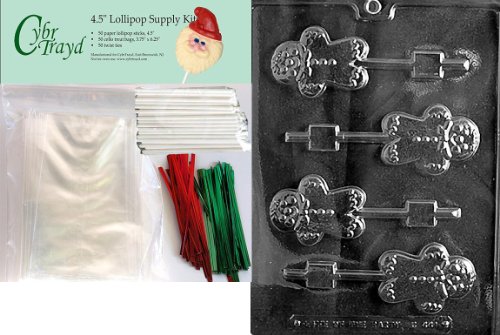 Cybrtrayd 45stK50C-C441 Gingerbread Man Lolly Christmas Chocolate Mold with Lollipop Kit and Molding Instructions, Includes 50 Lollipop Sticks, 50 Cello Bags, 25 Red and 25 Green Twist Ties
