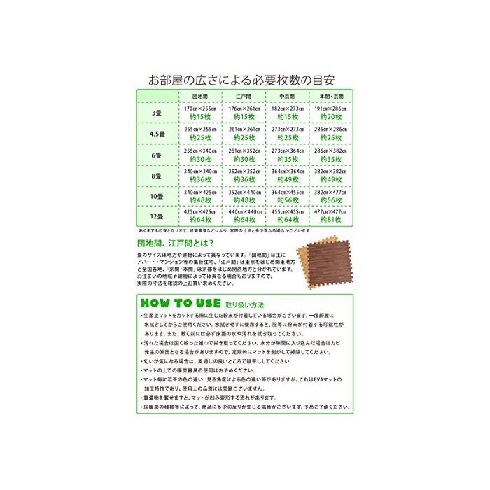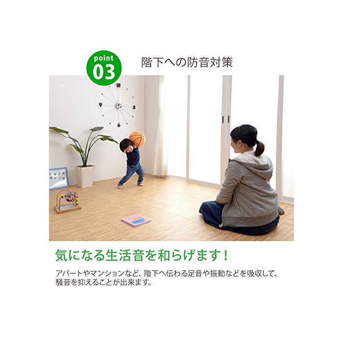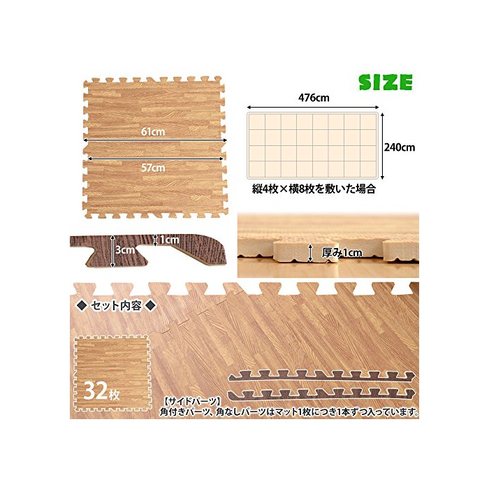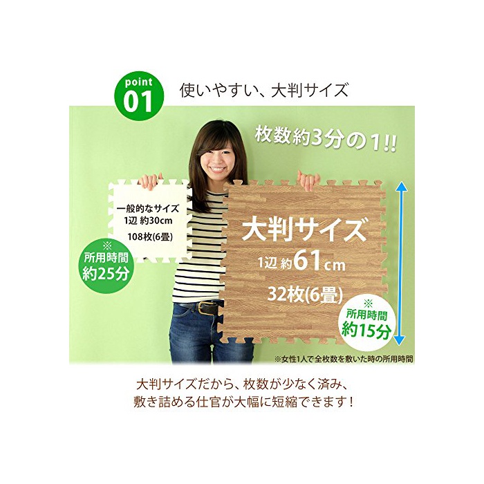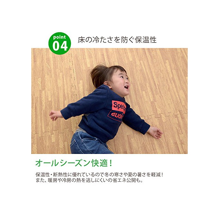 【추천 포인트!】조인트 매트 나무결 타입이 등장! / 자연을 이미지 한 나무결 디자인 / 설치 시간도 단축 할 수 있는 대형 사이즈 / 싸이드 파트 부착 / 쿠션성이 높게 상처 충격에 강한 EVA수지 / 아래층에의 방음 대책 / 마루의 차가움을 막는 보온성 / 커터나 가위에 간단하게 끊어지기 때문에 레이아웃 자유자재 / 더럽혀진 때는 날렵하게 1 닦아♪손질 간단 / 안심 non《호루무》! / 상난방 대응!