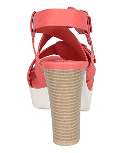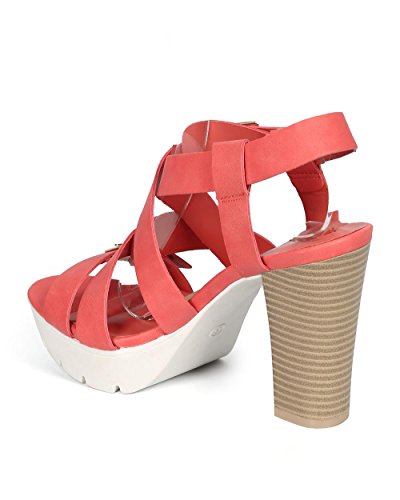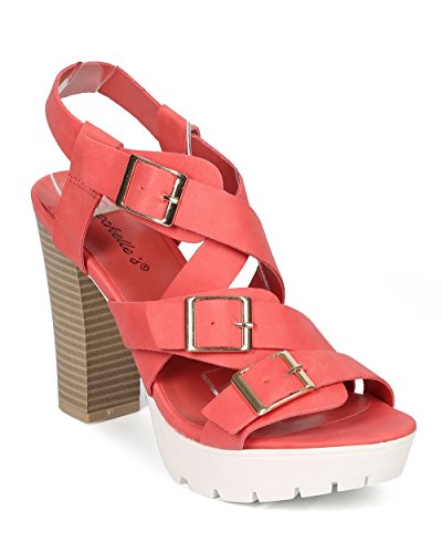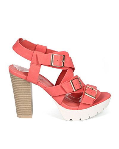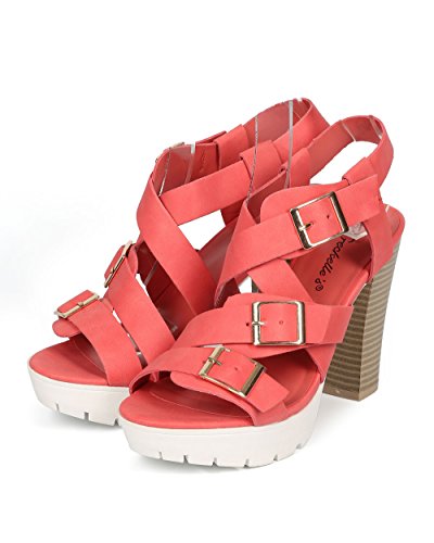 Breckelles CF79 Women Leatherette Cross Buckle Ankle Strap Lug Sole Chunky Heel - Grapefruit