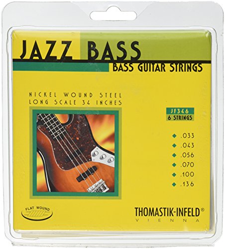 Studio : Thomastik Publisher : Thomastik Product Description Jazz Bass Strings from Thomastik-Infeld strings with extended durability and high output. A highly flexible steel core gives these bass strings a balanced feeling and special character. The overall sound characteristics can be described as very close to the double bass. Nickel flatwound with a round core. 34" scale.Gauges: .033 - .043 - .056 - .070 - .100 - .136. 0