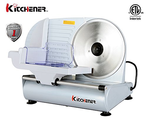 The Kitchener MS-106215R 9-inch Professional Electric Food Slicer features a removable blade for easy cleanup and the stainless steel material helps prevent rusting. The blade is powered by a belt-driven 150 watt motor that slices through your salamis, meats, hard cheeses, breads, firm vegetables and more quickly and easily. Adjustable thickness control knob adjusts from deli thin to 5/8" thick. Suction cup feet keep it sturdy and in place while slicing.