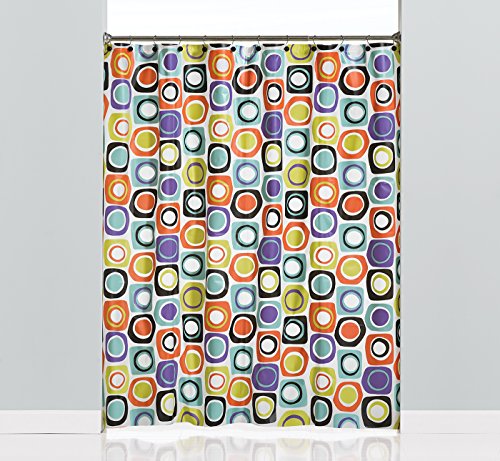 - The squares and dots PEVA shower curtain is a fun and bold geometric design in shades of orange, lime green, lavender, and aqua