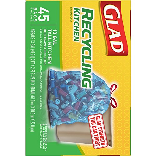 Recycling has never been easier with Glad Recycling Tall Kitchen Drawstring Trash Bags. These trash bags are designed to handle your heaviest recyclables while keeping your kitchen organized, clean and tidy. With the strong drawstring closure, the trash bag securely grips to your trash can to keep your recyclables in place until you are ready to take it out. Taking out your recyclables is a cinch with the drawstring bag. Simply pull up on the drawstring, tie and lift out of your trash can. Use this blue bag where applicable municipal blue bags are accepted. Recycling is made easy with the 13 gallon size trash bags. This drawstring trash bag is perfect for use in the kitchen or throughout the house and is great for your seasonal cleaning needs like Spring Cleaning and Back to School. Get a handle on trash with Glad.