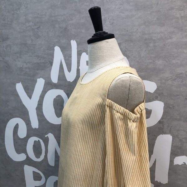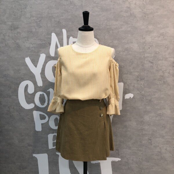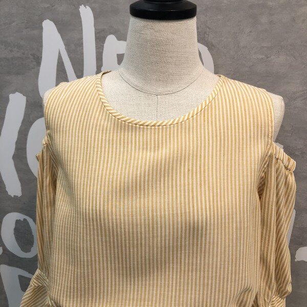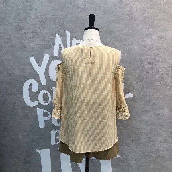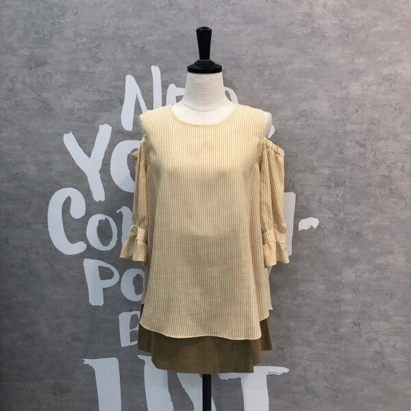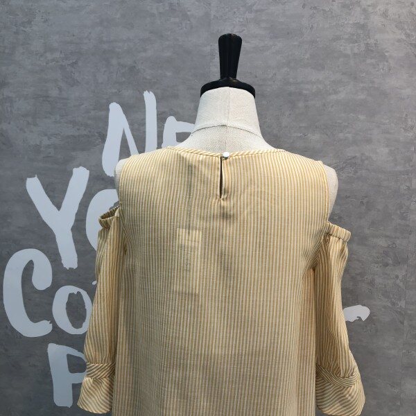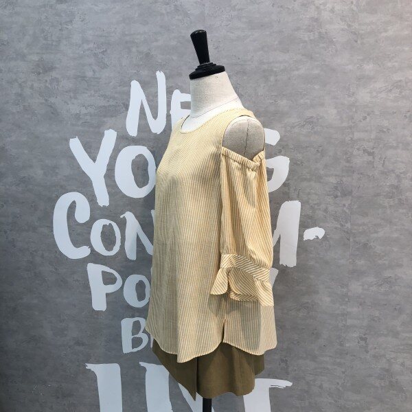 라운드넥에 잔잔한 스트라이프가 시원해보이는 어깨트임 포인트블라우스로 소매프릴 디테일이 여성스럽고 발랄한 분위기의 블라우스입니다
