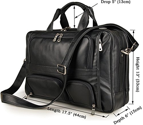 -. Feature : Material: Crazy horse cowhide leather Messenger bag. Polyester Lining. / Structure: 1 Roomy main compartment with internal laptop pouch. Interior main compartment pocket can holder most 14" 15", 15.6", 16" laptop well, also IPAD, chargers, some documents, mags, etc. 2 pockets without zipper for your cards, 2 pen slots. 1 big zipper pocket for your important things. It may not snugly fit all laptops due to the distinctive size of different models. / Closure: Zipper closure to keep your briefcase safe.Front pocket with easy-open push lock closure. 2 snap closure pockets in front and rear of the bag. Easy to put things like cigarette in or take them out / Strap:adjustable and removable long shoulder strap (about 55.11" in for the longest). The handle is about 3.94" in for the handbag. / Size info: (L) 16.14*(H) 11.81 *(W) 3.54" in, and weight is 3.30 pounds [Please pay attention about the weight before purchasing.