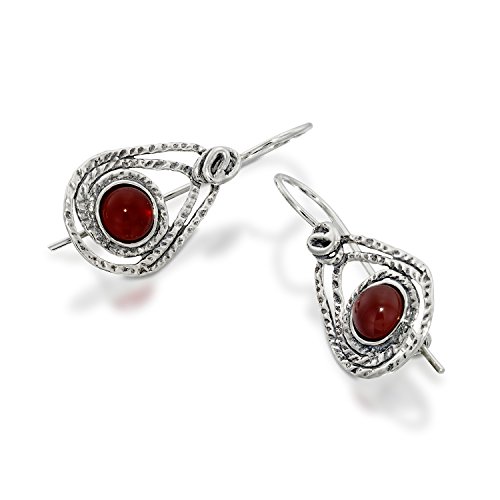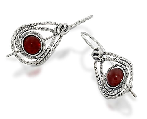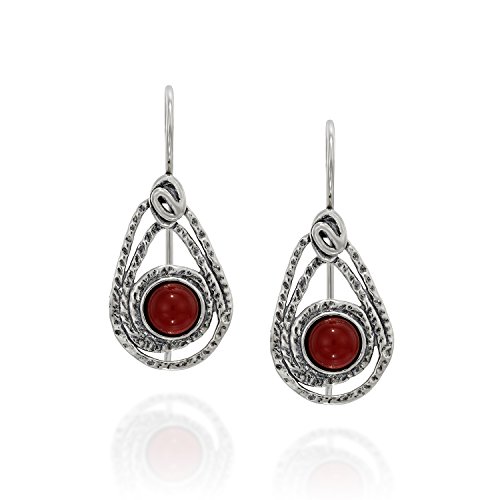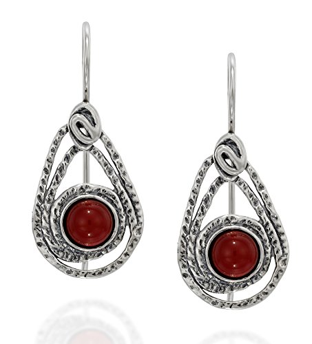 Vintage style teardrop shaped Carnelian earrings. 925 Sterling Silver drop earrings with Carnelian gemstone. A 6 mm round cabochon genuine Carnelian gemstone is inlaid in each of these textured free form teardrop shaped Silver earrings. Unique Artisan Design.