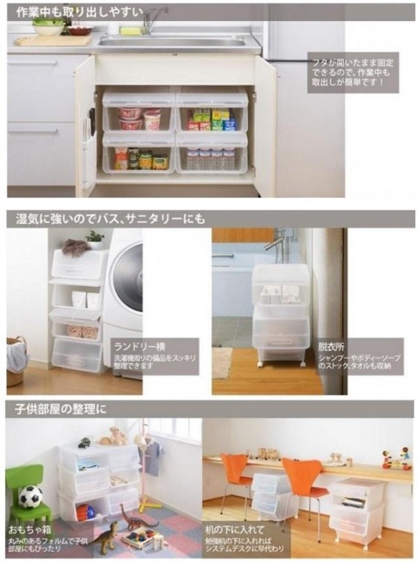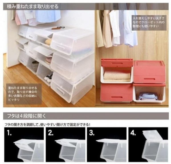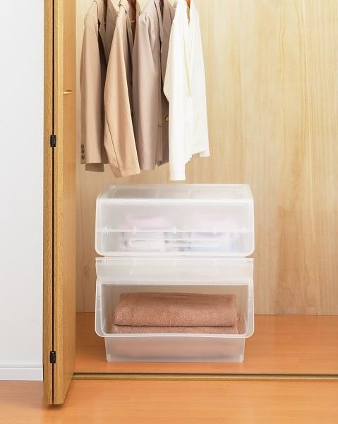 | うっすらと中が分かるクリアタイプと、中を隠せるカラータイプ(4色)がございます。しまうモノ、使う人、使う場所で使い分けできるので便利です♪ |