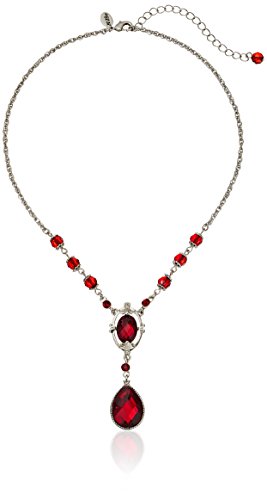 Silver-tone y-necklace featuring pear-shape red faceted stone and oval-shape red faceted stone at center with red faceted beads