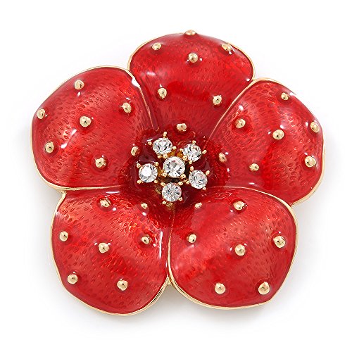 Brighten up your style with this Red Enamel, Crystal Flower Brooch In Gold Plating. Featuring a 5 petal flower shape design, crafted in gold plated metal and covered with dark red enamel detailing. The centre of the flower garnished with clear crystals for a dash of sparkle. The bold and striking floral design is great for setting off your favourite jacket or top. It measures about 50mm in Diameter, and secures with a flag pin and revolver fastening.Feature