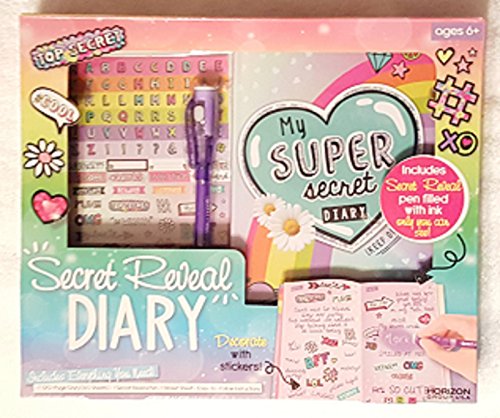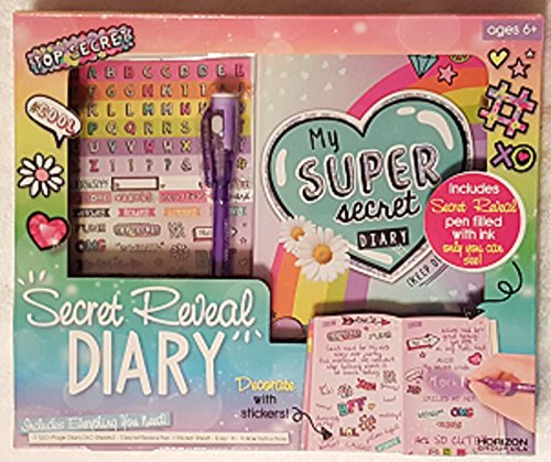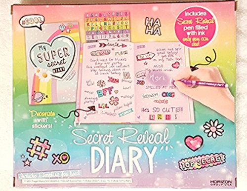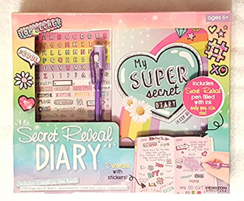 Studio : Horizon Group USA, Inc. Publisher : Horizon Group USA, Inc. Binding : Toy Product Description Awesome Secret Reveal Diary "Super Secret Diary" Kit with 120 Pages to Keep Your Secrets Dreams On! Super Secret Diary Includes Stickers and a Secret Pen with Ink Only You Can Read! Includes Easy to Follow Instructions. Great Development Tool with Journal Activities for Young Girls As They Keep Their Daily Activities, Secrets and Dreams in Their Diary. Makes a Great Gift Idea for ANY Occasion! As Shown in Images. 0
