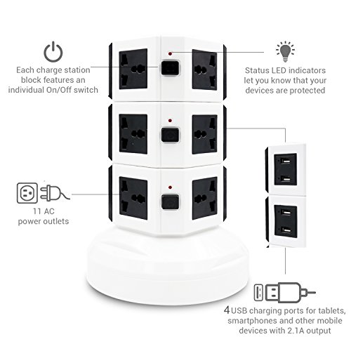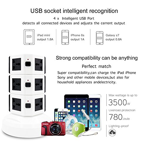 Safemore 10-Outlet Power Strip with 4 Smart USB Charging? ? Safemore USB power strip is a ideal solution for charging multiple devicessimultaneously,4 USB charging ports are a fantastic bonus.? ? Unique towerdesktop design to make it more convenient for life, you canplug everything into this power strip including those bulky power supplyadapters.? ? Two independent switches to make it easy to turn off the appliances when notin use,ENERGY SAVING!? ? LED indicator make you aware especially at night, offers more safety andconvenience.? ? Safemore USB power strip is made of advanced flame-resisting materials withbuilt-in overload protection, short circuit protection, overcurrentprotection.? Specification? -Rated Power: 3500W? -Voltage: AC 100V-250V? -Rated Current: 13A Max? -USB Output: 5V/2.1A? -Color: Black -Cord Length: 9.5 Feet? ATTENTION:? YOU MAY NEED TO ADD SOME STRENGTH WHEN YOU PLUG IN OUR POWER STRIP TOWER.? It is our special design that the plugs are tight in order to prolong the life-spanof the product.?And you may need to add some strength to get plugs in atthe previous period.? After used for some time, it will get a little loose for your plugs. It is anormal phenomenon. So please rest assured on our product.? SATISFACTION GUARANTEED: We offer you 100% risk-free satisfaction guarantee to let you buy withconfidence. We are quite sure that you will be super-impressed with theDURABILITY, PORTABILITY and HIGH QUALITY of IdentikitGift Automatic VacuumSealer. Otherwise 100% MONEY BACK. 0 |