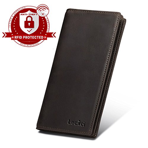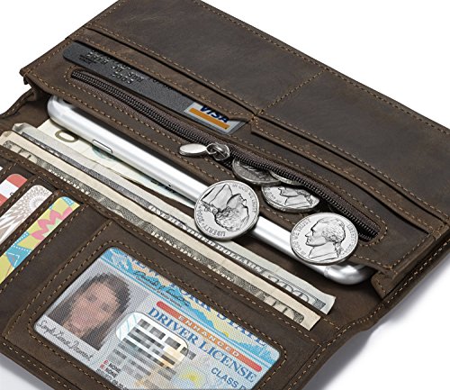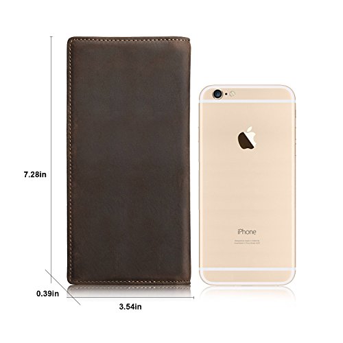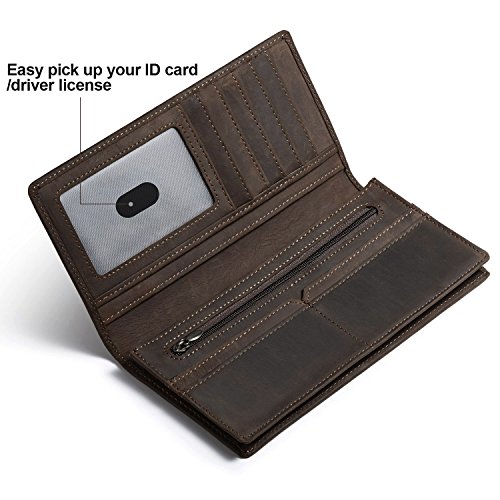 -. Feature : ✔ RFID BLOCKING, SAFETY, P.R.IVACY, effectively protect your credit cards, no worry for unsafety in crowds / ✔ Made by crazy horse genuine cowhide leather, premium polyester lining, soft comfortable hand feeling / ✔ Multi-purpose: 9 credit card slots, 3 pouches for bills, cash and checkbooks, 1 ID window, 1 zipped pouch for coins, bills or valuable cute stuffs / ✔ UPDATED design with a hole in the ID window slots, easily taking out your driver license or photos. / ✔ Dimensions: 7.28 * 3.54 * 0.39 inches(L*W*T), slim figure, easy put into your overcoat pocket