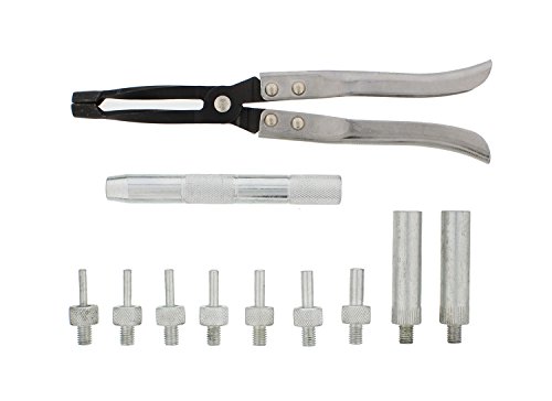 Specifications: Precision machined seal driving adapters guide the seal for proper setting; Valve pliers includes a 6” (15.2cm) handle and is 10.5” (26.7cm) long overall to reach narrow spaces; Pliers jaws are serrated for extra grip and has a 5.5” (14cm) maximum jaw opening; Knurled ends on 2” (5.1cm) adapters for tapping down the new seal and 6” (15.2cm) handles to provide extra grip; 3.5” (8.9cm) deep sockets for seals O.D. 10.8mm to 14.8mm
