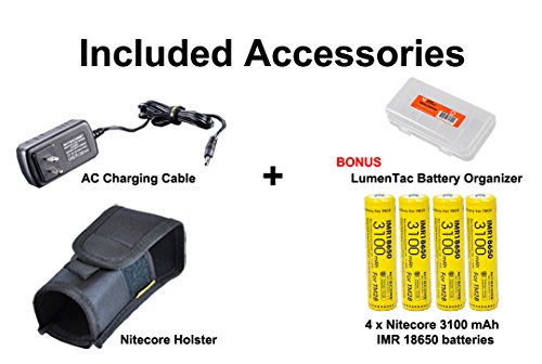 BUILT-IN CHARGER with BATTERIES - Nitecore TM28 flashlight, 4 x Nitecore 3100mAh IMR 18650 batteries, AC adapter, lanyard, holster, spare o-ring, spare charging port cover, flat top battery connector.