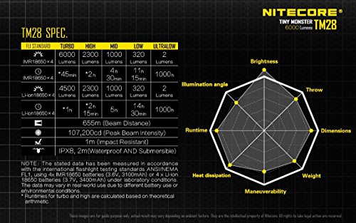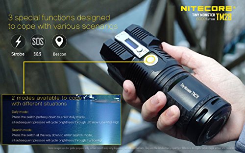 INSANELY BRIGHT - 6000 Lumens Nitecore TM28 flashlight is the latest upgrade to the TM26 featuring four CREE XHP35 HI LEDs combined for 107,200 candelas and an incredible 716 yards throw. Perfect for search and rescue.
