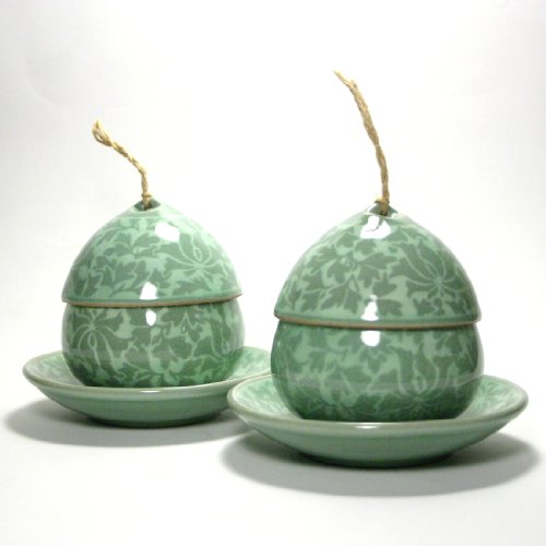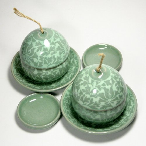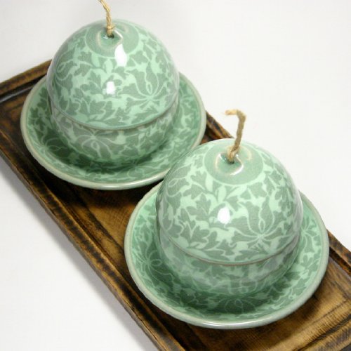 -. Feature : Traditional Dhangcho (Korean-style Arabesque) pattern is inlayed with the traditional Sanggam technique, which dates back to the mid-twelfth century. / A unique, natural h.e.m.p-style string is tied on top of each lid, resembling an Asian bamboo hat. / The set comes with 2 cups, 2 lids, 2 ceramic infusers, 2 lid holders, and 2 saucers. / Made in studio in Yeoju, Korea.