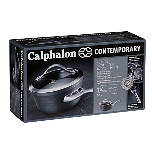 Featuring a hard-anodized exterior and nonstick interior. Calphalon ContemporaryNonstick combines durability and performance with fast clean-up and easy low-fat cooking.. Heavy-gauge aluminum construction ensures even heating and is hard-anodized for durability. It also makes it dishwasher-safe. Interior includes three layers of nonstick coating – two layers provide durability and the third layer offers easy release performance. The long, brushed stainless steel handles are designed to stay cool on the stovetop. Pans and covers are also oven safe, making it ideal for finishing a gourmet dish. High sides and narrow opening minimize evaporation during slow process of stock- and soup-making. Heavy-gauge sloped bottom heats evenly makes stirring easier. The nonstick surface means you can cook healthier using less fat, with effortless cleanup. Comes with Calphalon's full lifetime warranty.Feature