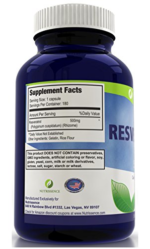 CONVENIENT CAPSULE FORM – Contains 180 capsules or 180 servings of 500mg of Resveratrol, 90 servings at 1000mg or 60 servings at 1500mg.