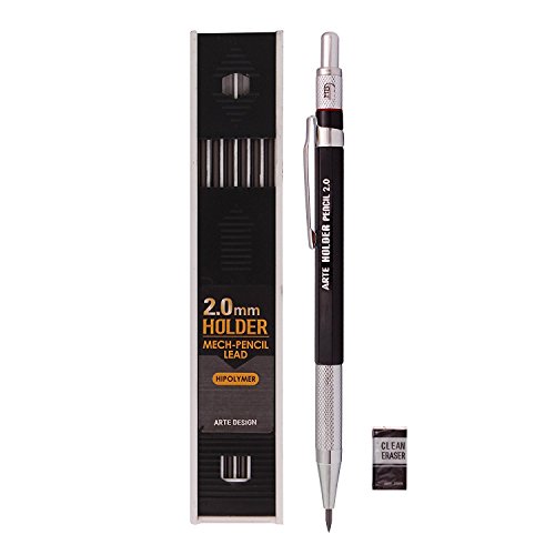 Arte Design 2.0mm Lead Holder Pen Mechanical Pencil for Draft Drawing, Art Sketching Carpenter +(Lead 1 Pack,Eraser) (Black Body)