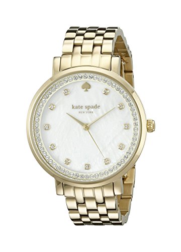 -. Feature : Gold-tone watch featuring logoed pearlescent dial with sparkling bezel and indices / 38 mm metal case with mineral dial window / Japanese quartz movement with analog display / Stainless steel bracelet with deployant-clasp closure / Water resistant to 30 m (99 ft): In general, withstands splashes or brief immersion in water, but not suitable for swimming