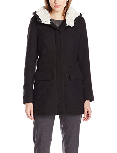 Zip-front coat with covered placket featuring seamed waist and sherpa-lined hood