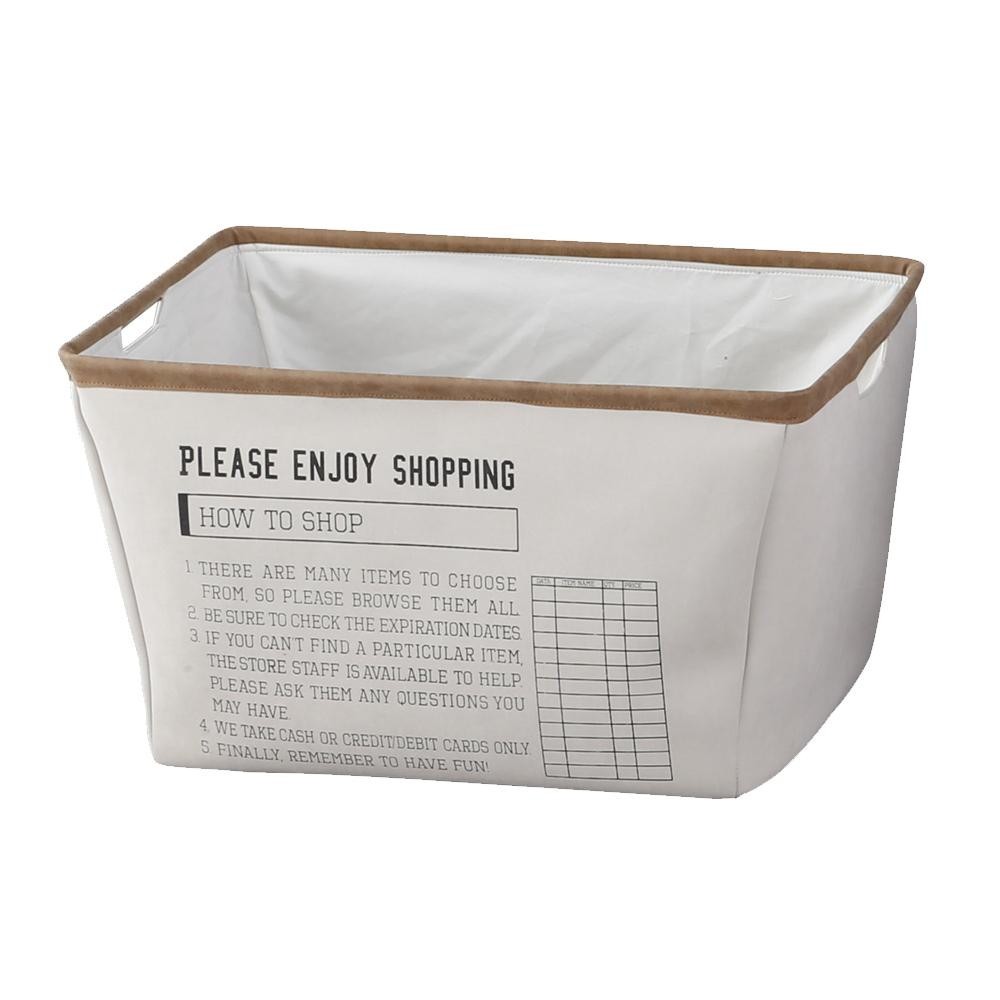 | フェイクスウェード風生地で作られた触りごこちがソフトなボックスです。ショッピングシートをイメージしたプリントには買い物のメソッド(方法)が書かれていてユニークなデザインとなっています。 |