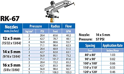 IrrigationKing RK-67 1-1/2" FNPT Impact Mini-Gun Sprinkler with Nozzle Set - (12, 14, 16 mm) x 5 mm, NPT Female, 103.3 GSM Maximum Flow Rate