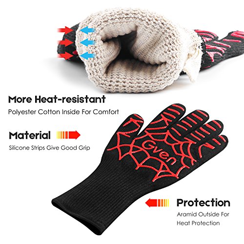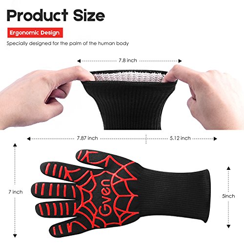 ★Extreme Heat Resistant Gloves:Gven BBQ gloves is 100% isolated with heat by special processing of the multi-layer protection and able to withstand temperatures up to 932 F. The difference is other cooking mitts were not cert over 400 F.