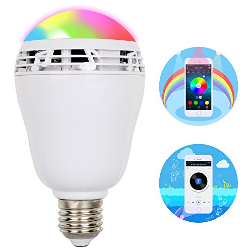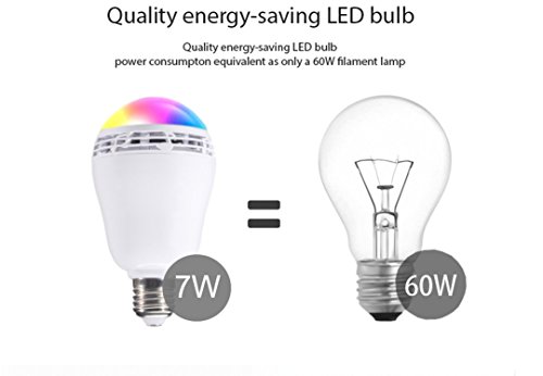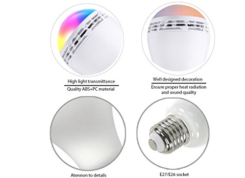 Feature: 1. LED bulb+ Bluetooth Music Speaker, it's bulb but also a speaker. 2. Bluetooth connected, wireless control and app control. ( IOS and Android) 3. Multi color light bulb, the color will dance with the music rhythm. 4. Dimmable led bulb, you can dim the brightness of bulb easily to suit your mood. 5. Use away mod to turn on/off the light at different times you want, give appearance that someone is at home. 6. Set a timer to light the bulb automatically, to wake you up on time. 7. 12 watt led light bulb, but equivalent to 60 watt incandescent light. 8. 1 year warranty, this is not support to set groups via bluetooth!