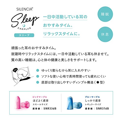 Pink Marble :( sound insulation value 33dB) relaxation time and weekday of the Blue Marble at night :( sound insulation value 37dB) each two pairs of 8 pieces when sleepy slowly, such as weekends, no case. - Material: Polyurethane - Producing countries: Sweden Size: 22.5mm (full-length) × 12.3mm (diameter) pink marble · 23.5mm (full-length) × 12.3mm (diameter) Blue Marble ear of night time. The bedtime and relaxation time, while also rest ears that are active throughout the day. High-quality sleep, supports the mind and body health beauty. • The soft comfortable to use fatigue even with a long period of time. * It is easy into your ear because slowly swell. - out easy dimple structure.