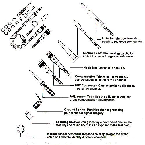 Sumnacon® 2 Pack P6100 100 MHz 600V DC High Sensitivity Oscilloscope Clip Probe 10:1 and 1:1 Switchable with Mini Alligator Clip and Ground Lead for Rigol Atten Owon Siglent,HP Tektronix,RIO DSO, Hitachi,GwInstek