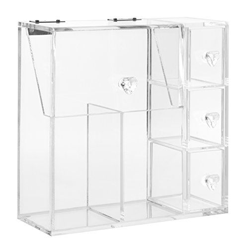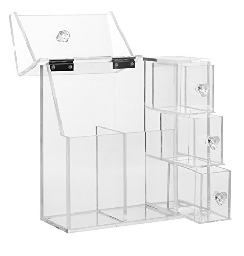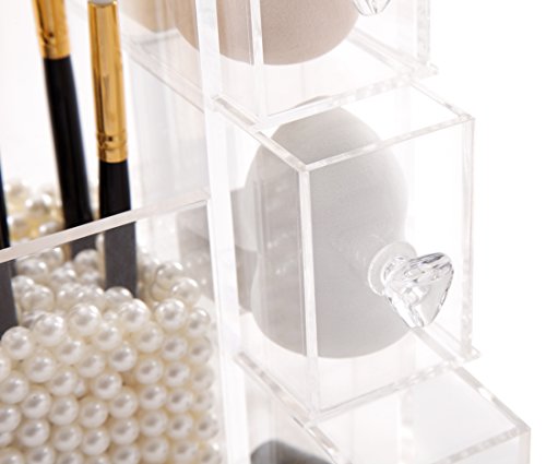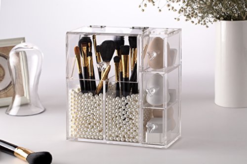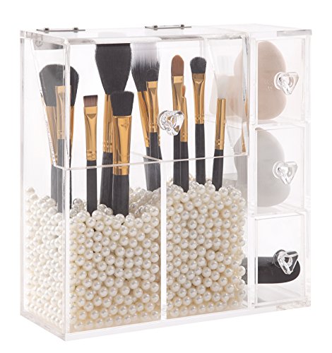 PuTwo Makeup Organizer With 2 Make Up Brush Holders and 3 Drawers All In One Case with Free White Pearl