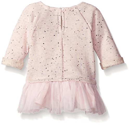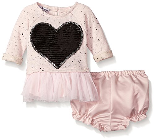 This pretty pink sweatshirt inspired dress has a sparkly sequined heart at the bodice and a soft tutu skirt
