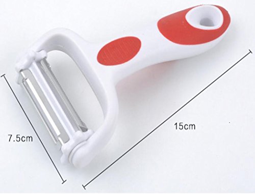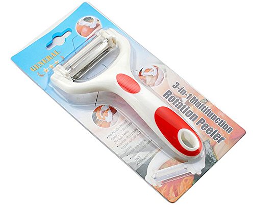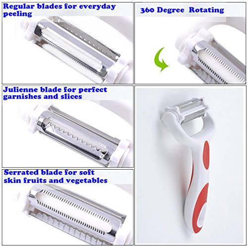3 in 1 Mulitifunction Rotation Peeler - Citrus Fruit Peeler for Orange Apple Cocktails - Carrot and Apple Peeler with Rotating Serrated Straight and Julienne Stainless Steel Slicer Blades (03: Red)