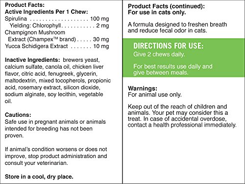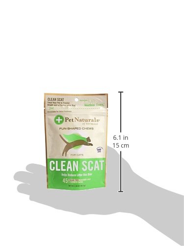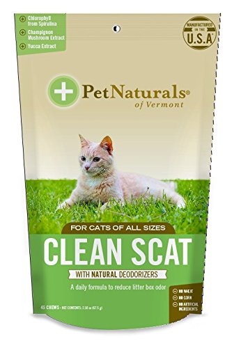-. Binding : Misc. -. Brand : Pet Naturals -. EAN : 0026664979148 -. Feature : Clean Scat includes Spirulina - is a very good source of Chlorophyll which has a deodorizing effect and helps clean the body of toxins / Champignon Mushroom Extract has been studied extensively for its ability to reduce odors and improve intestinal conditions / Yucca Schidigera Extract has been shown to reduce the intensity of fecal order in cats by altering the production or availability of hydrogen sulfide in the large intestine. / Pet Naturals of Vermont supplements are free of wheat, corn and artificial ingredients / Pet Natural's of Vermont products are Veterinarian formulated, NASC approved and manufactured in the USA. -. IsAutographed : 0 -. IsMemorabilia : 0 -. Label : Pet Naturals Of Vermont -. Manufacturer : Pet Naturals Of Vermont -. Model : 0700791.045 -. MPN : 700791.045 -. NumberOfItems : 1 -. PackageQuantity : 1 -. PartNumber : 700791.045 -. ProductGroup : Pet Products -. ProductTypeName : PET_SUPPLIES -. Publisher : Pet Naturals Of Vermont -. Size : 45 -. Studio : Pet Naturals Of Vermont -. Title : Clean Scat, Digestive Support and Odor Control for Cats, 45 Bite Sized Soft Chews- Pet Naturals of Vermont -. UPC : 026664979124