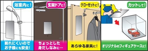 ハサミなどでかんたんにカットでき、粘着タイプなのでかんたんにどこにでも取り付けできます。素材はプラスチックの中でもトップクラスの耐衝撃性を誇るポリカーボネート樹脂を使用しました。割れにくくなっているのでお子様がいるご家庭でもお使いいただけます。浴室や玄関ドア、クローゼットの扉、オリジナルのフィギュアケースなど、多用途にご使用ください。 |