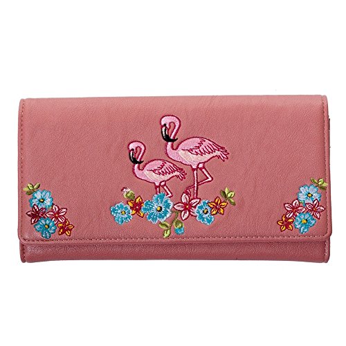 Binding : Apparel Product Description Material: 100% PU, Lining: 100% PVC Dimensions: approx. 19 x 2,5 x 10 cm - embroidered Flamingoes and flowers - two large compartments for bills - zip compartment for coins - 13 card holders, one of which is transparent - two larger compartments for other documents. 0