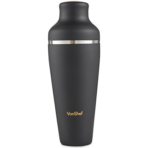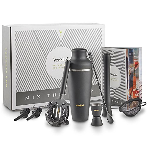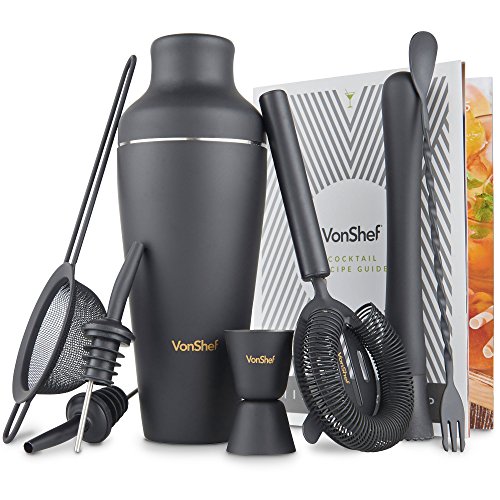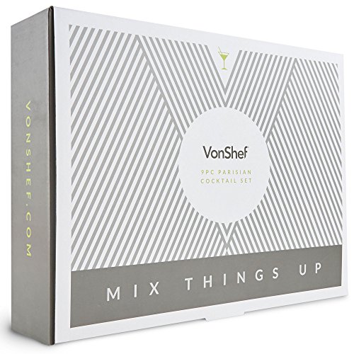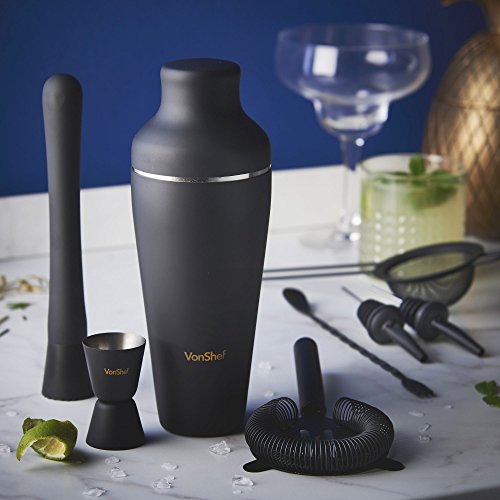 VonShef 9pc Matte Black Parisian Cocktail Set Give professional bartenders a run for their money with the VonShef Parisian Cocktail Set. Packed with all the essentials you need to host your very own cocktail party, the set helps you create a variety of cocktails with ease and sophistication. Contemporary 19oz capacity Parisian Cocktail Shaker boasts an on-trend and extremely robust matte black coated stainless steel body. Must-Have Accessories The set comprises: Stainless Steel Muddler Let's you crush hard ingredients with ease to unleash and infuse flavors for mouth-watering cocktails. Stainless Steel Bar Spoon/ Fork Twisted double-ended design featuring a spoon for stirring at one end and a fork to remove garnishes at the other. Stainless Steel Hawthorne Strainer Sits on top of the shaker - strains away ice and other unwanted ingredients i.e. pips and large bits of fruit. Stainless Steel Julep Strainer Strain your cocktail concoctions directly over your glass with the julep strainer - ideal if you're straining muddled ingredients like fresh mint or lime. 0.5oz/ 1oz Shot Measuring Jigger Double-ended design - essential for getting alcohol and liquor quantities exactly right. 2 X Stainless Steel Pourer Enjoy smooth free-flow pouring with the two included pourers - ideal for attaching to your favorite spirit bottles and preventing spills. Gift Box Recipe Guide Supplied in a stylish gift box with a matching recipe guide to get you started - this set is a great present for a loved one or as a treat to yourself. Accessories Measure: ?Parisian Shaker: H9.5 X D3.5 inches; Capacity: 17oz user capacity -19oz max ?Muddler: L8 X W1" ?Bar Spoon: L19" ?Strainer: L5.5 X W4.5 ?Jigger: D3.8 X H3"